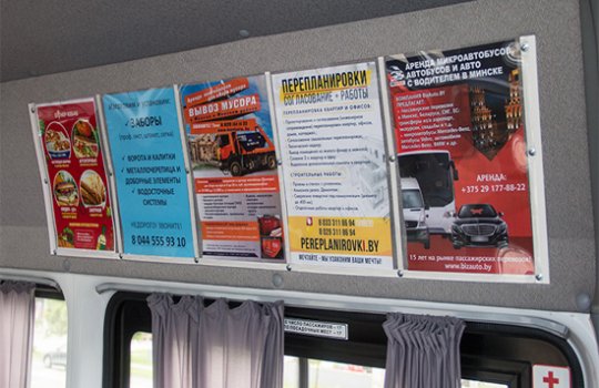 Монтаж рекламы в маршрутках осуществляется по-разному в зависимости от того, какой рекламный материал и где размещается.